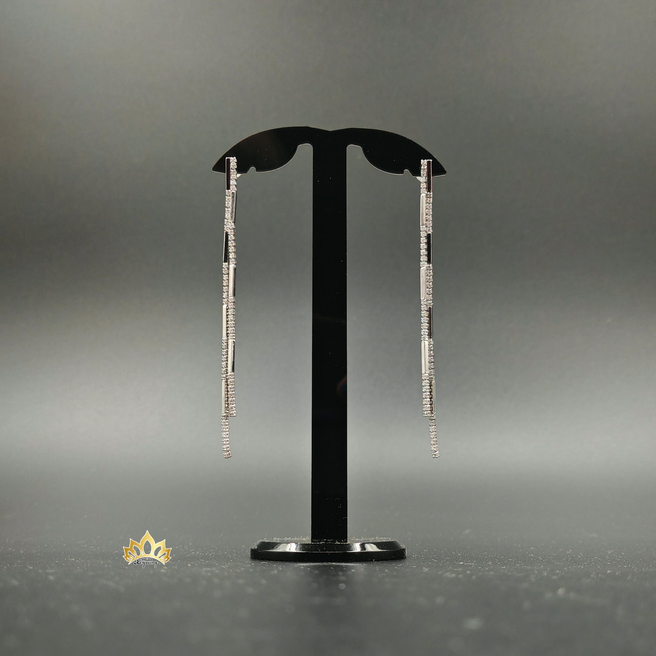 Длинные, элегантные линии из тонких металлических полос, покрытых многочисленными сверкающими кристаллами, создают эффект бесконечного блеска. Каждая деталь продумана до мелочей: чёткие геометрические формы, игра света — всё это делает их невероятно современными и роскошными.