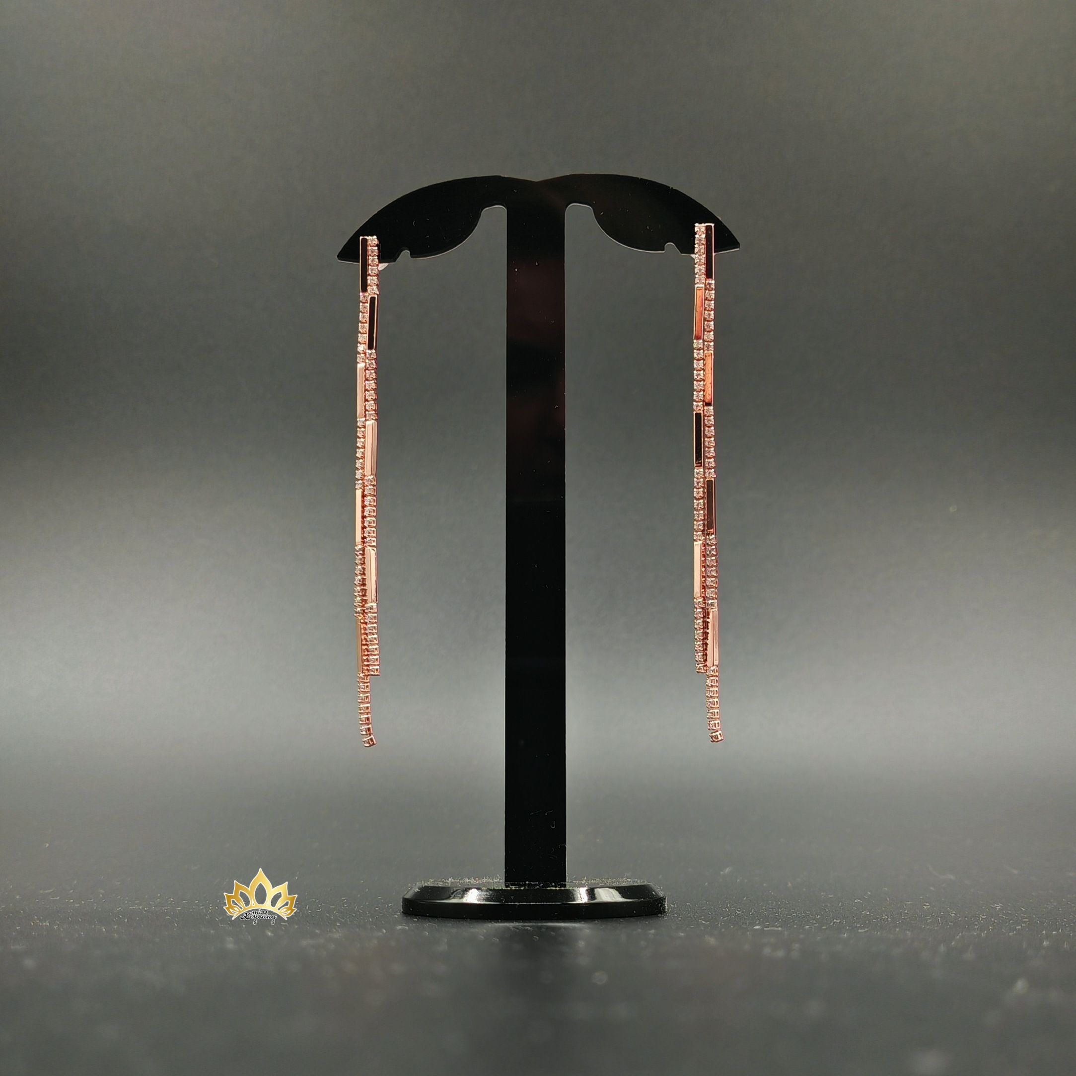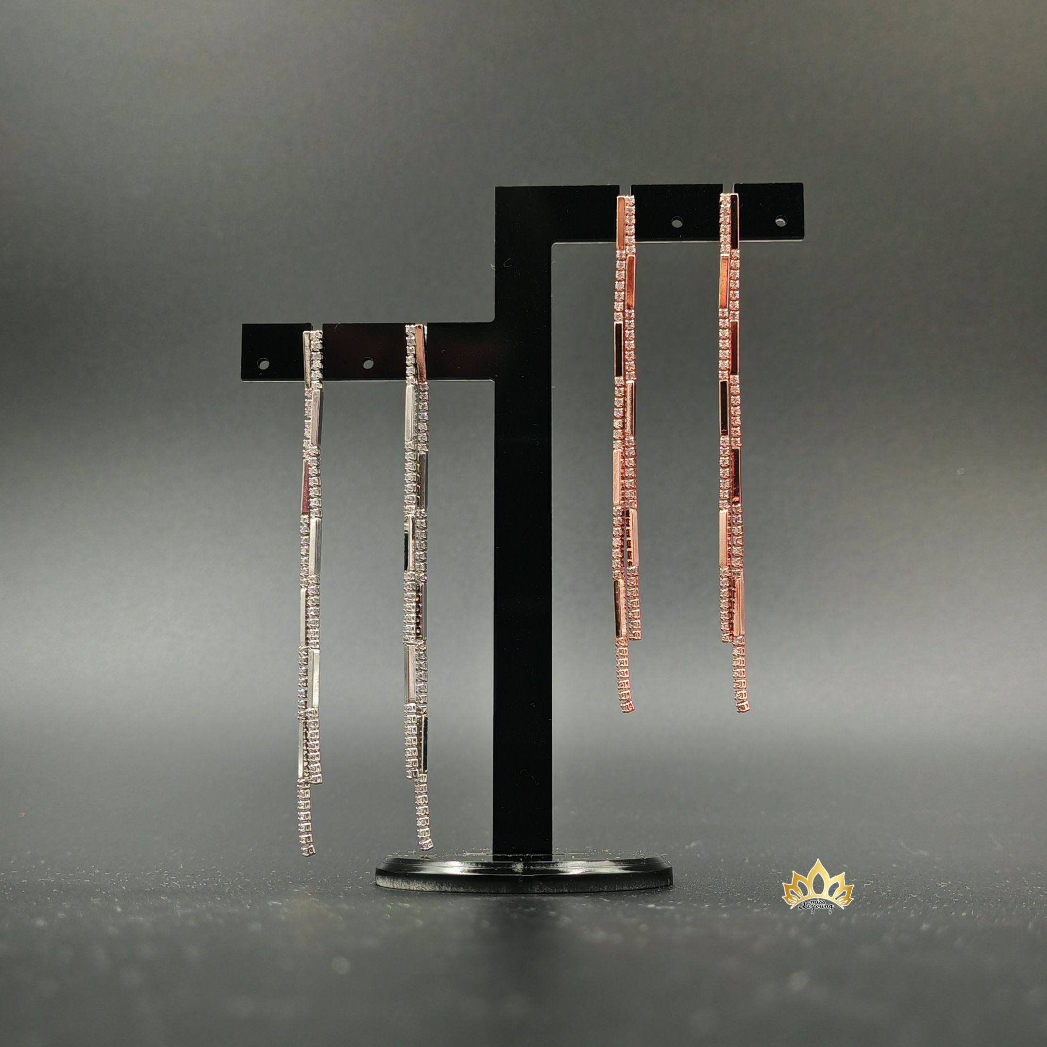 Длинные, элегантные линии из тонких металлических полос, покрытых многочисленными сверкающими кристаллами, создают эффект бесконечного блеска. Каждая деталь продумана до мелочей: чёткие геометрические формы, игра света — всё это делает их невероятно современными и роскошными.